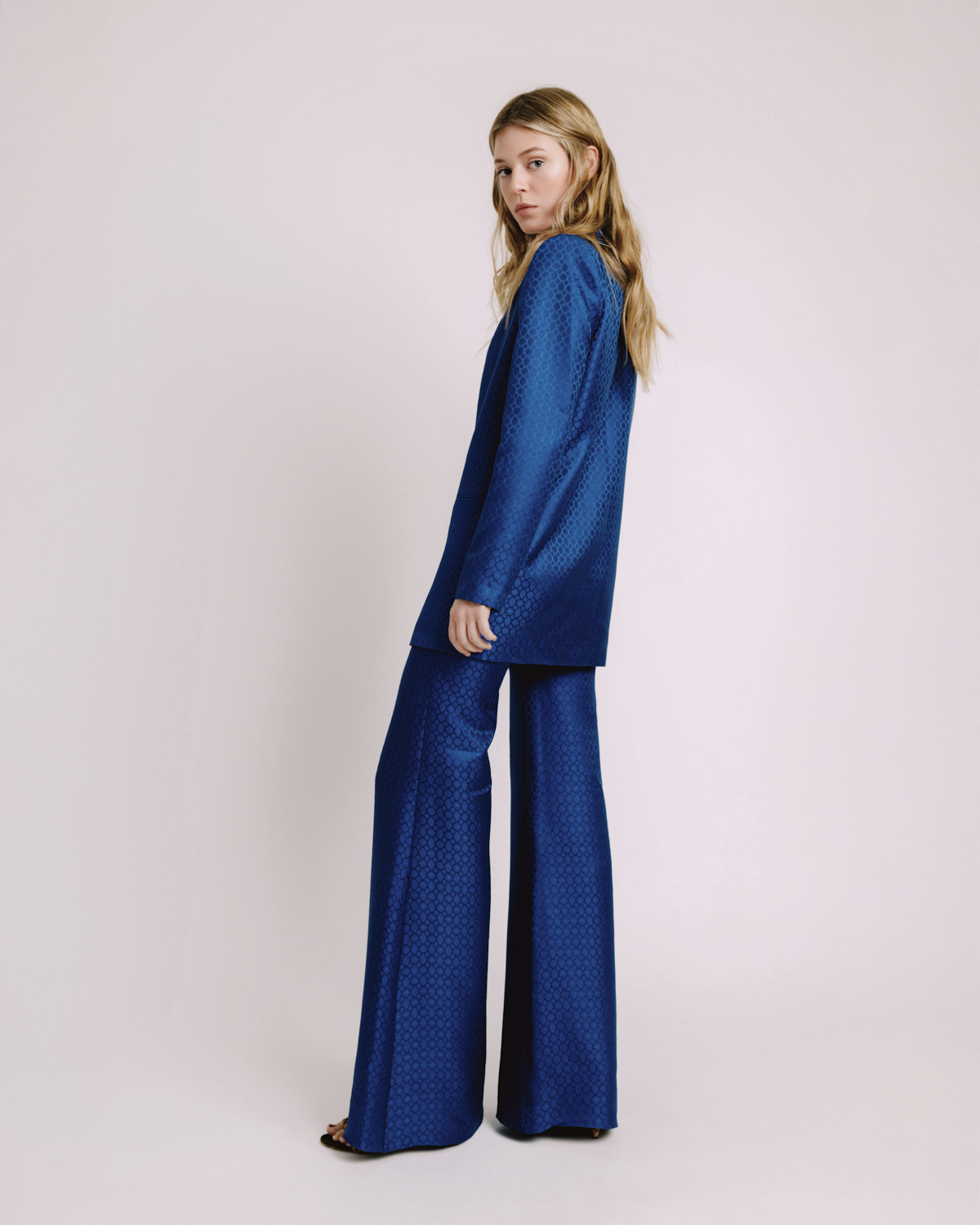 A modern take on classic masculine silk robes, this long-line jacket is crafted from an exquisite electric blue jacquard, rich in texture and structure while remaining 100% silk. Fully lined in black silk crepe, it has the perfect balance of elegance and edge, giving the feel of a mini-coat with the ease of a blazer. The three-button closure adds a refined, tailored touch, making it a standout piece on its own or part of a full power look.