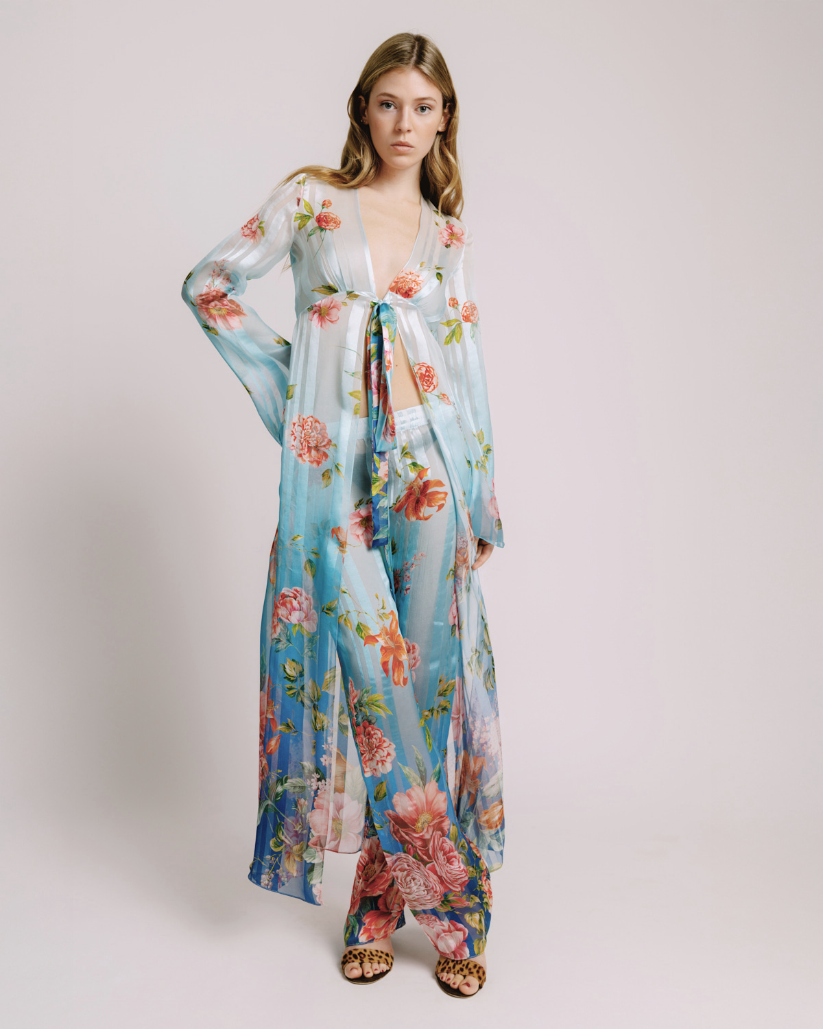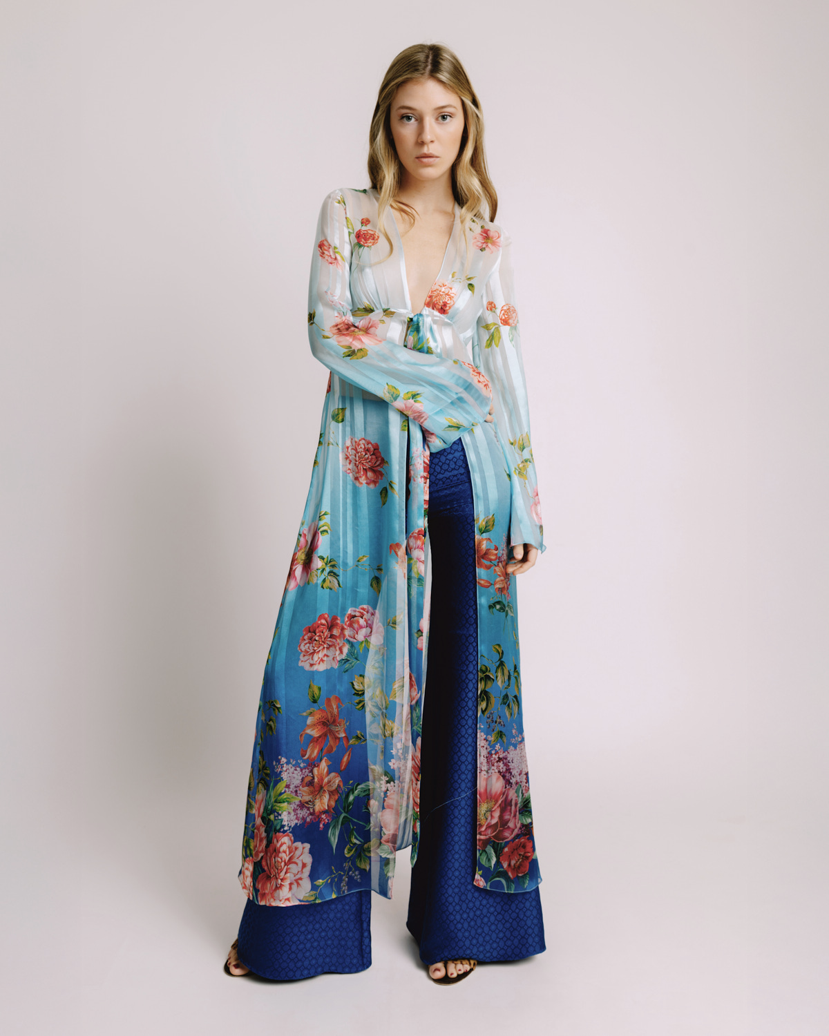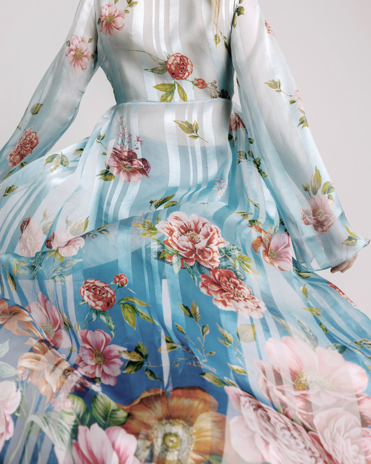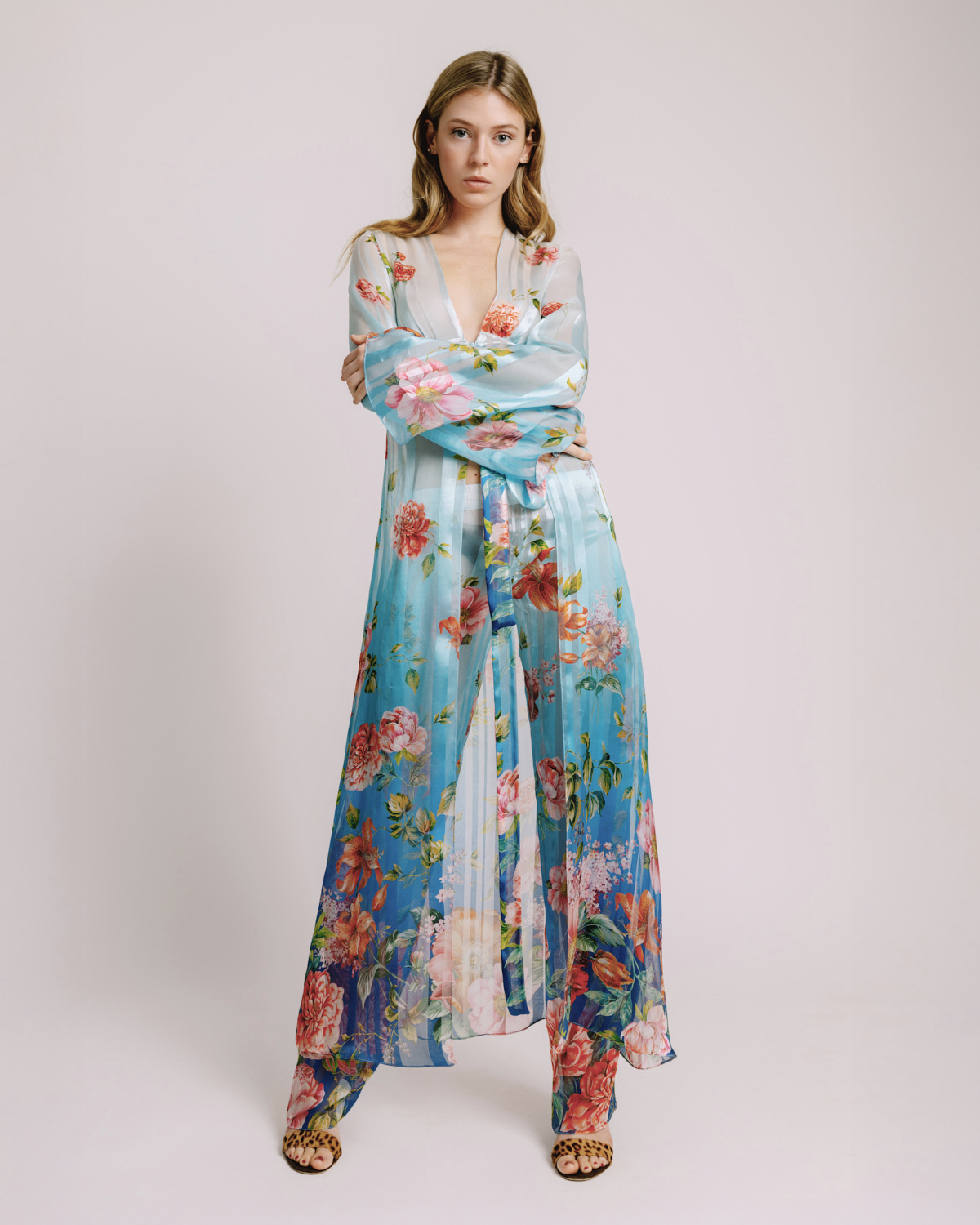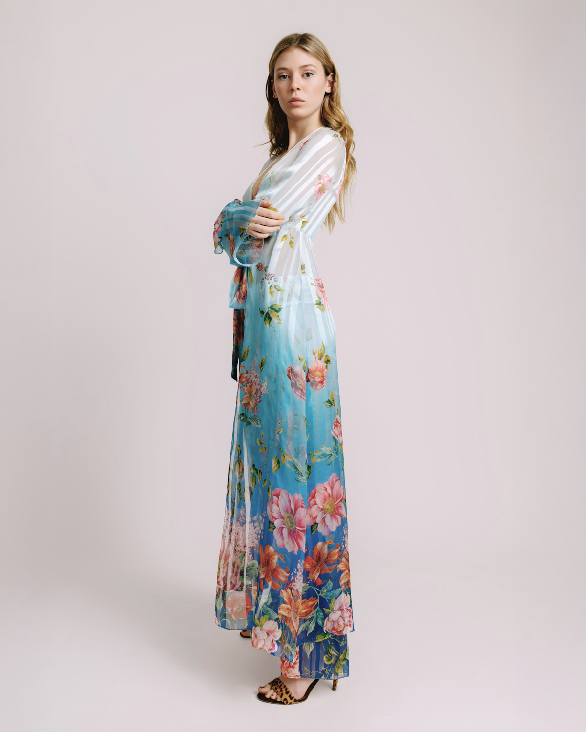 A dreamlike, ethereal piece that moves effortlessly with you. This sheer silk chiffon robe is crafted from delicate striped silk, featuring a beautiful degradé print that transitions from soft whites to shades of blue, ending in a deep electric hue, all adorned with coral-toned florals. Each panel is meticulously placed to enhance the natural flow of the design, creating a stunning visual effect as it drapes.
