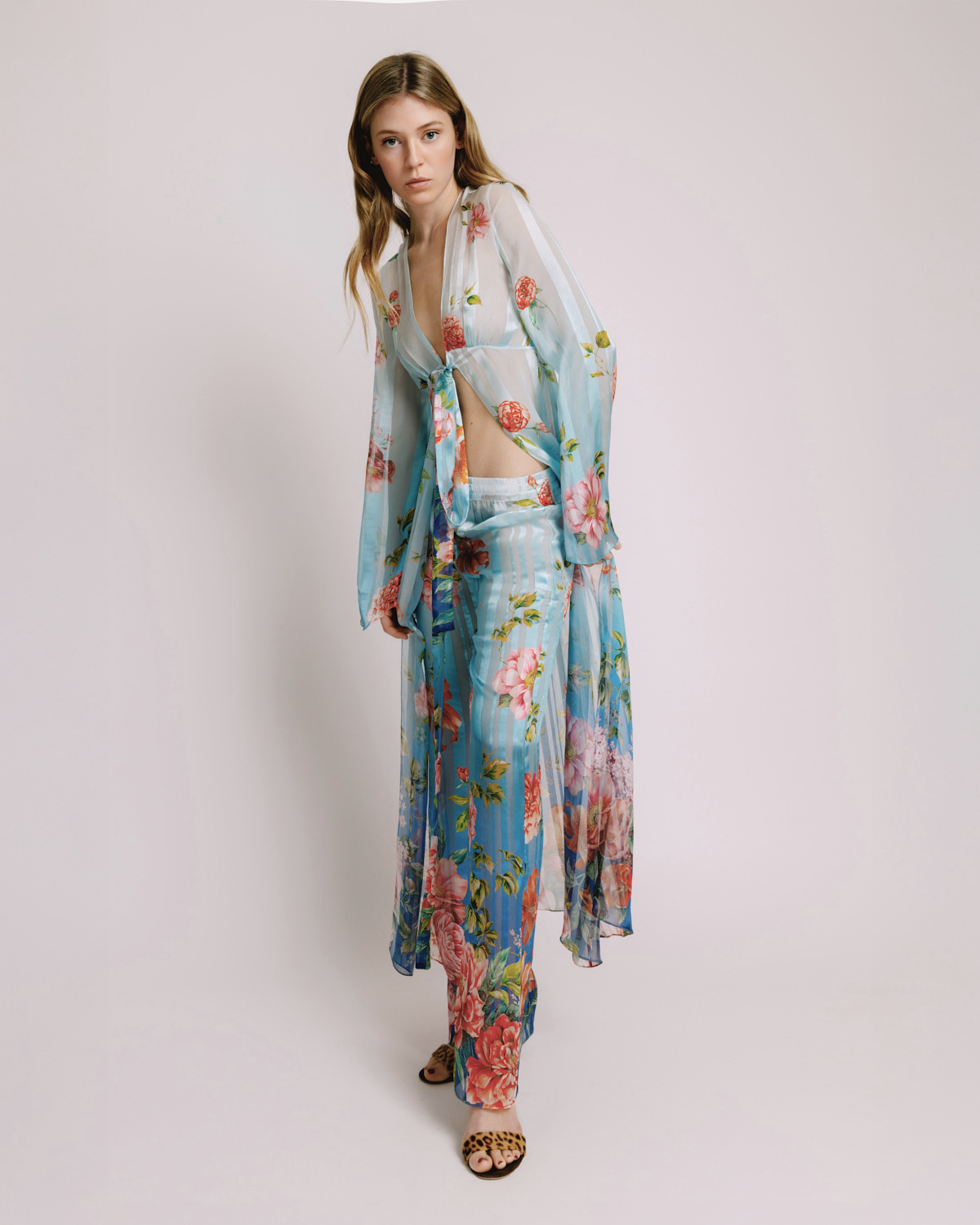 Long and fluid, the robe has no buttons, closing only with a soft silk tie for an effortless, undone elegance. Wear it over a bikini for a chic resort look, or layer it over the matching pajama-style trousers for a sophisticated yet relaxed statement outfit. Whether styled for day or night, this piece is pure, effortless beauty in motion.