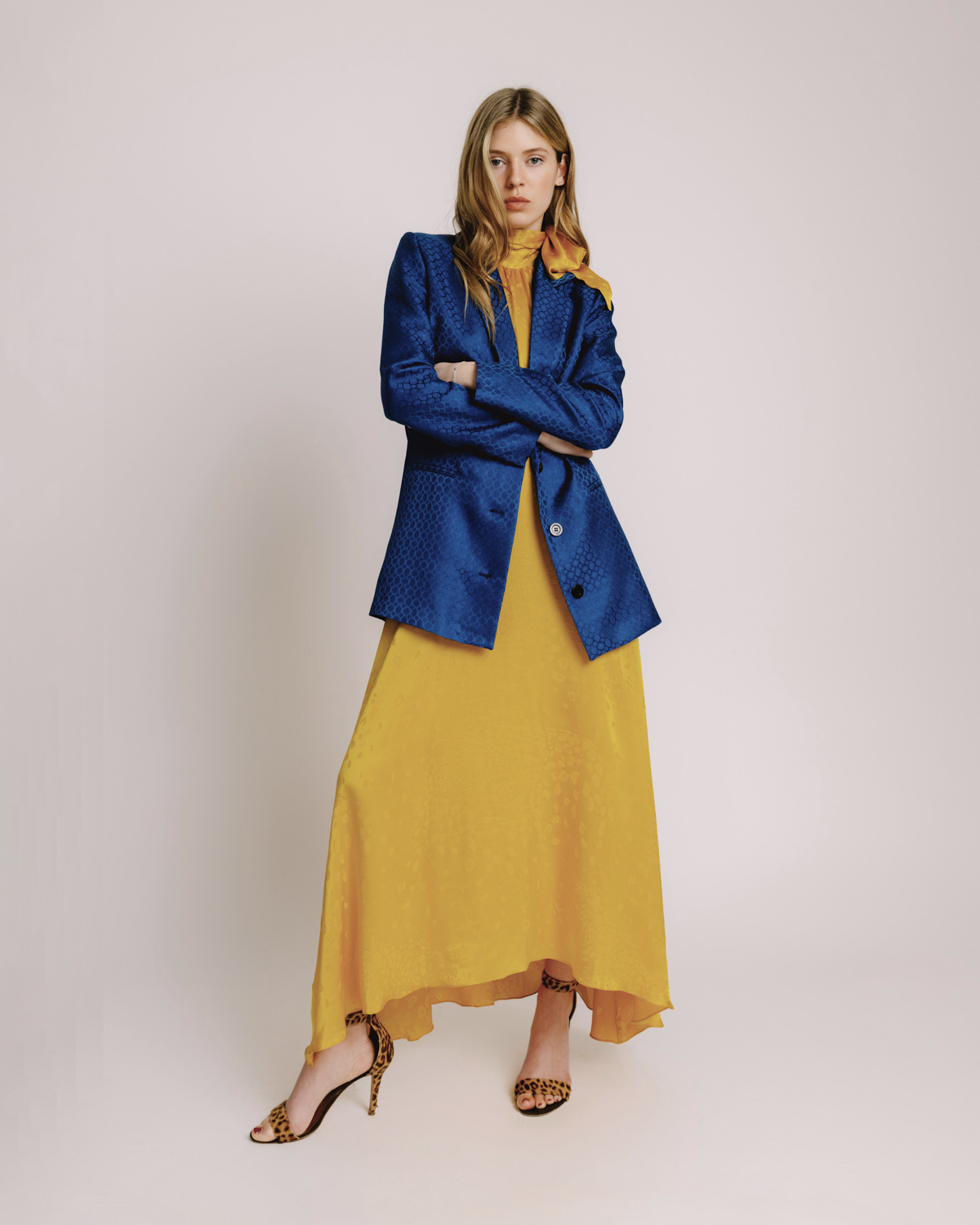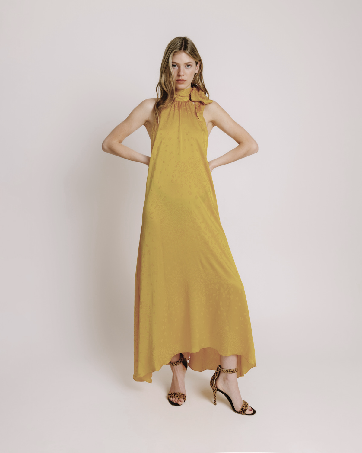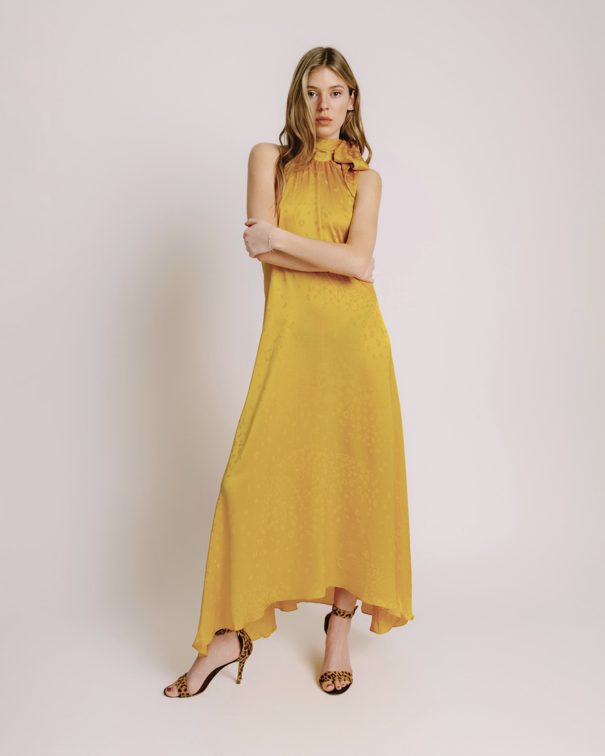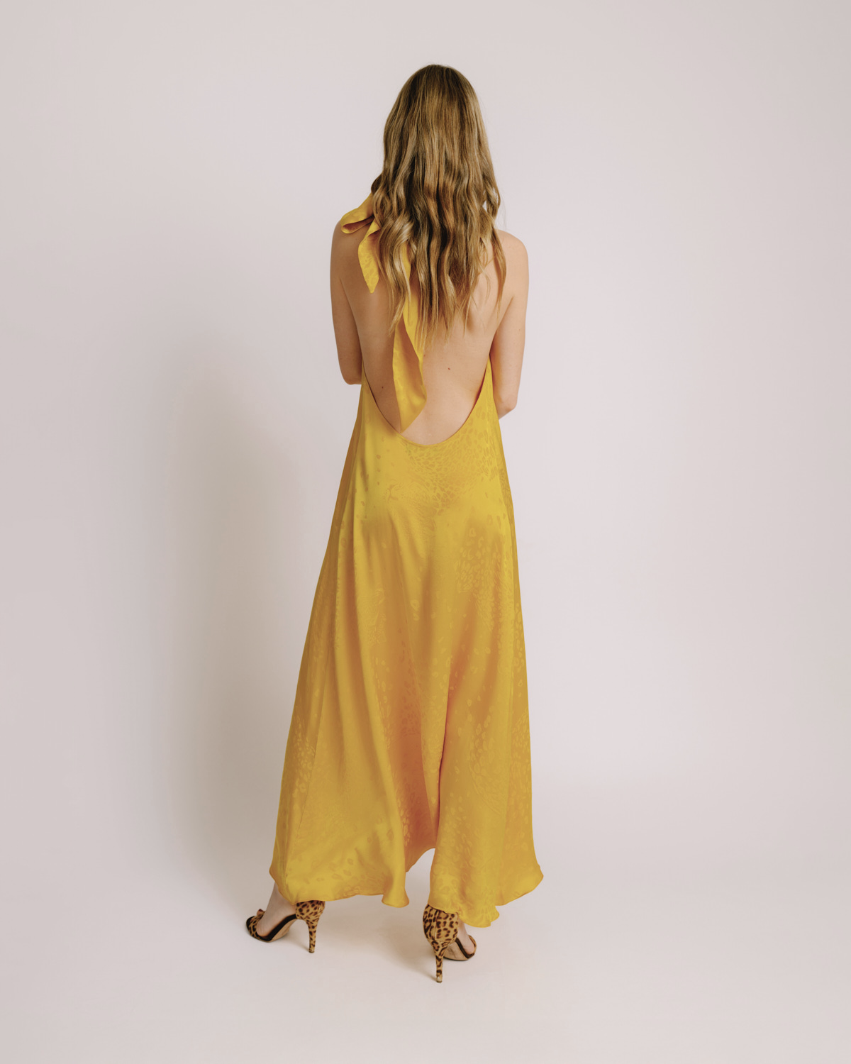 Effortless glamour with a bold yet fluid silhouette. Crafted from golden yellow satin jacquard with a subtle woven leopard pattern, the Glen Dress is all about movement and elegance. The high halter neckline ties gracefully, leading into a dramatic open back, while the wide, flowing shape creates a sense of ease and sophistication. As it falls, the fabric gains more volume, enhancing its natural drape and making every step feel weightless.