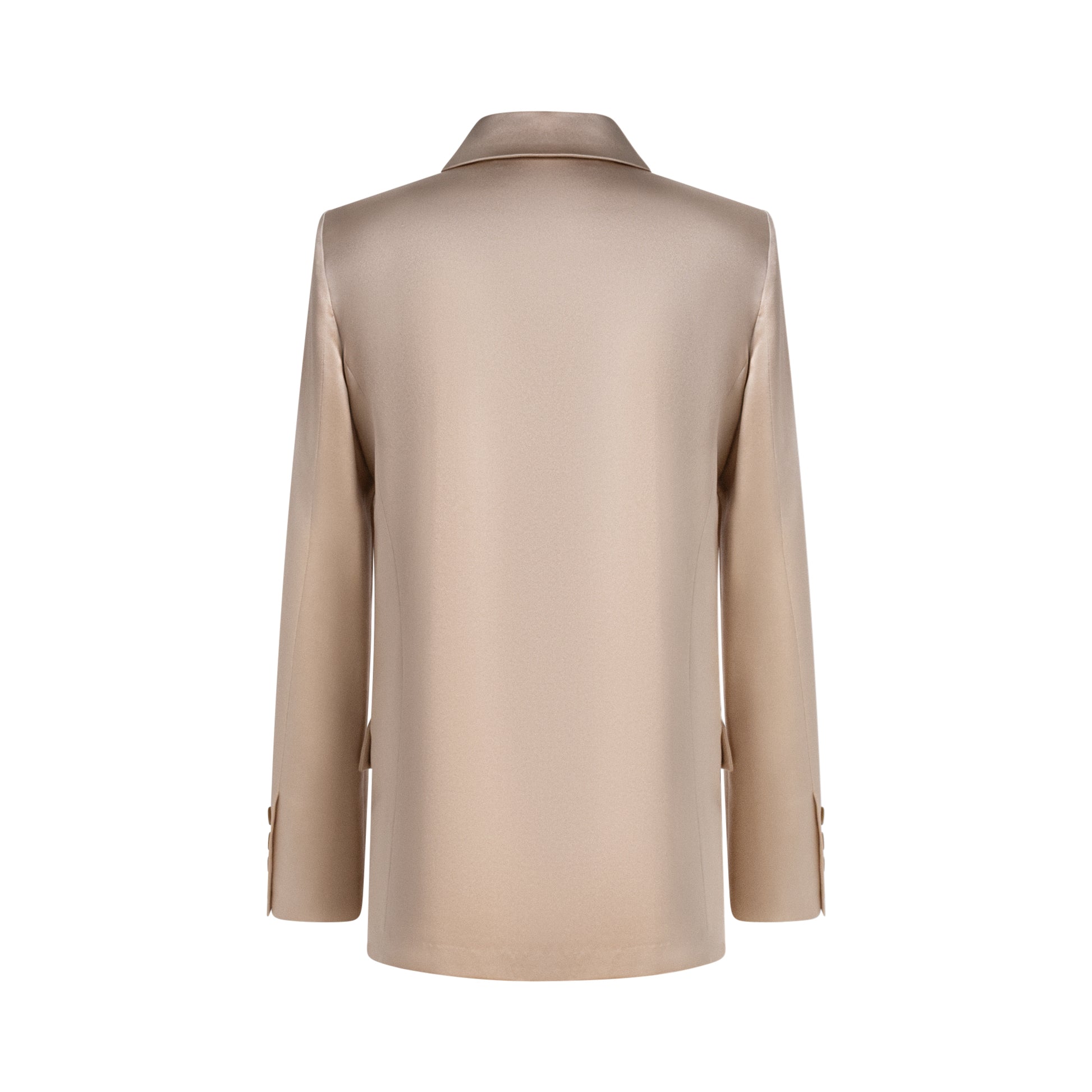 Crafted in 100% Italian silk, the Lauren Jacket features a structured silhouette with padded shoulders and a sharp double-breasted front. The golden tone adds a warm, luminous touch — easy to style with its matching pants or to layer over your favorite basics. Fully lined and fluid, this blazer brings together polish and sensuality in one effortless piece.