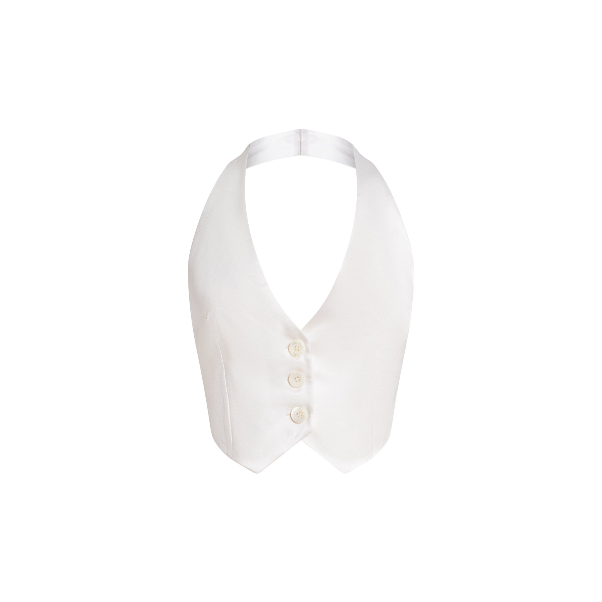 Crafted from 100% satin silk in a luminous white finish, the Tom Vest redefines classic tailoring with a sensual twist. Its clean lines, sharp tailoring and refined back closure make it the perfect layering piece — worn alone or under a blazer.